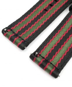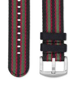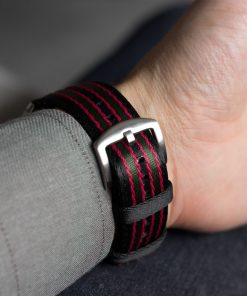 Detta armband är tillverkat av dubbelvikt nylon med en tjocklek på ca 3mm som både är slitstarkt och flexibelt. Den silkeslena ytan påminner om säkerhetsbälten och sitter bekvämt runt handleden. Hålen är värmeförseglade för högre hållbarhet. Det finns 10 hål för storleksjustering vilket gör att du enkelt kan anpassa storleken efter din handled.